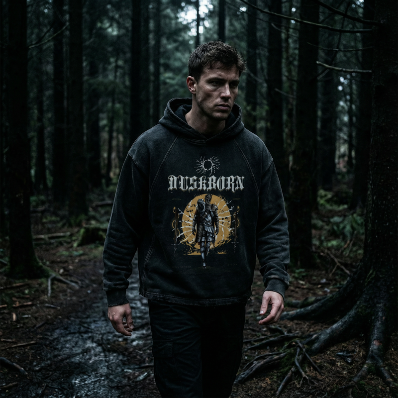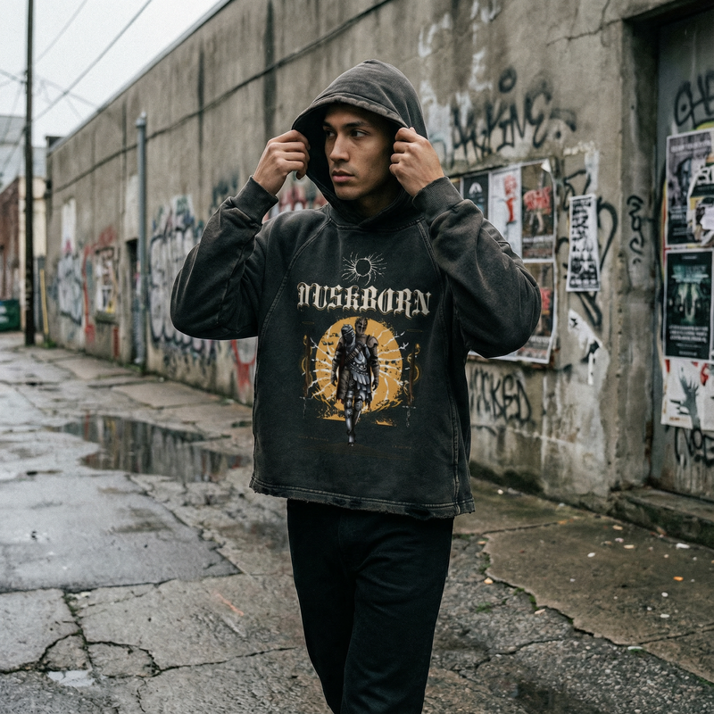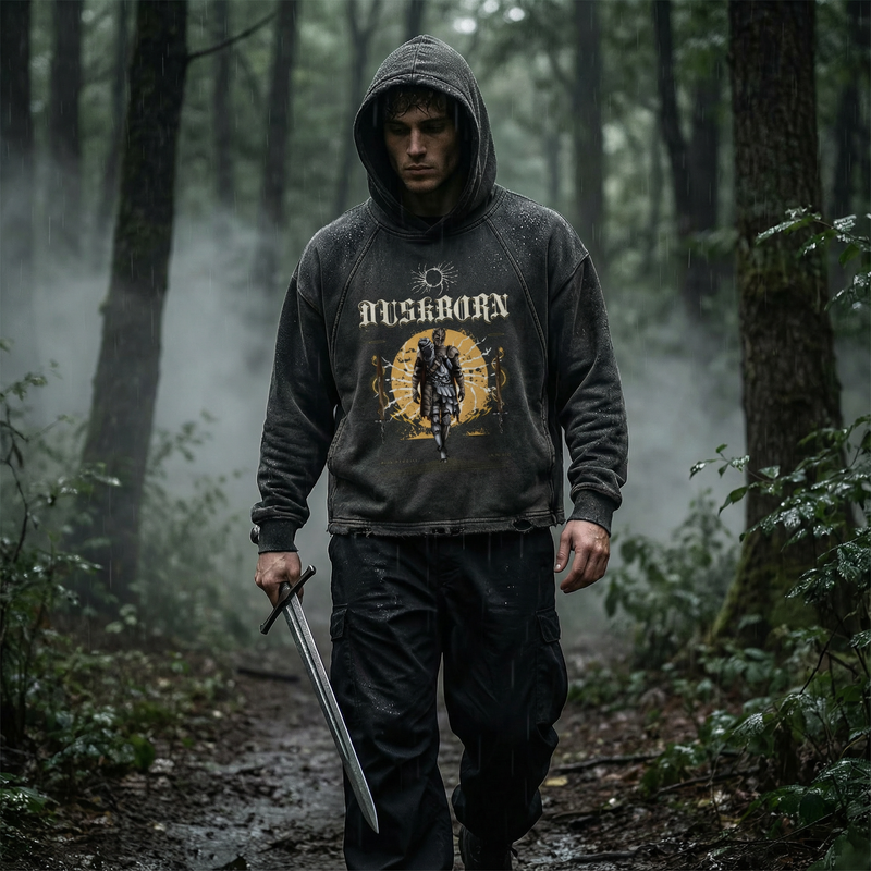 "Duskborn" Washed Black Frayed-Hem Hoodie